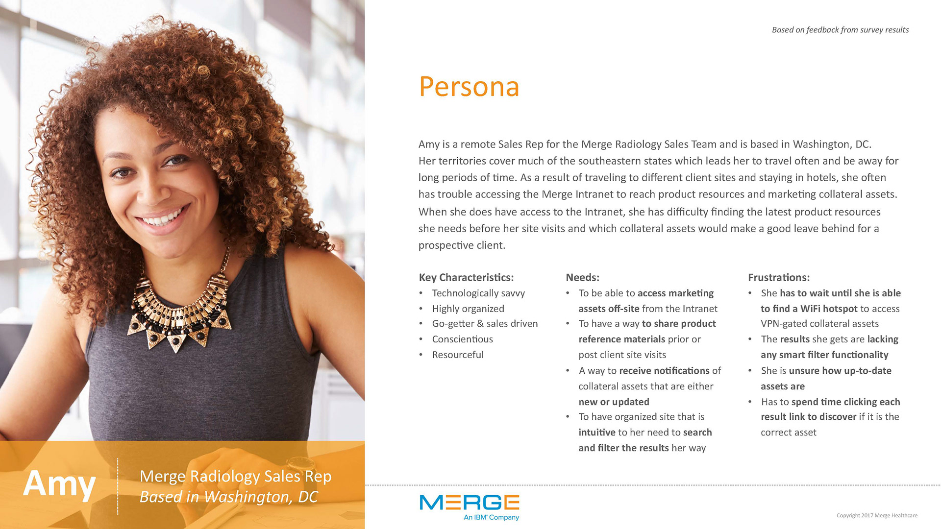 After synthesizing the feedback from our survey participants, a persona was developed to represent a typical user’s personality allowing the Marketing team to understand a Sale's Representative problems when traveling or at a client-site, and how a new asset management system could fill in those pain-points by becoming a strong tool for success in communication and easy access to product resource materials.