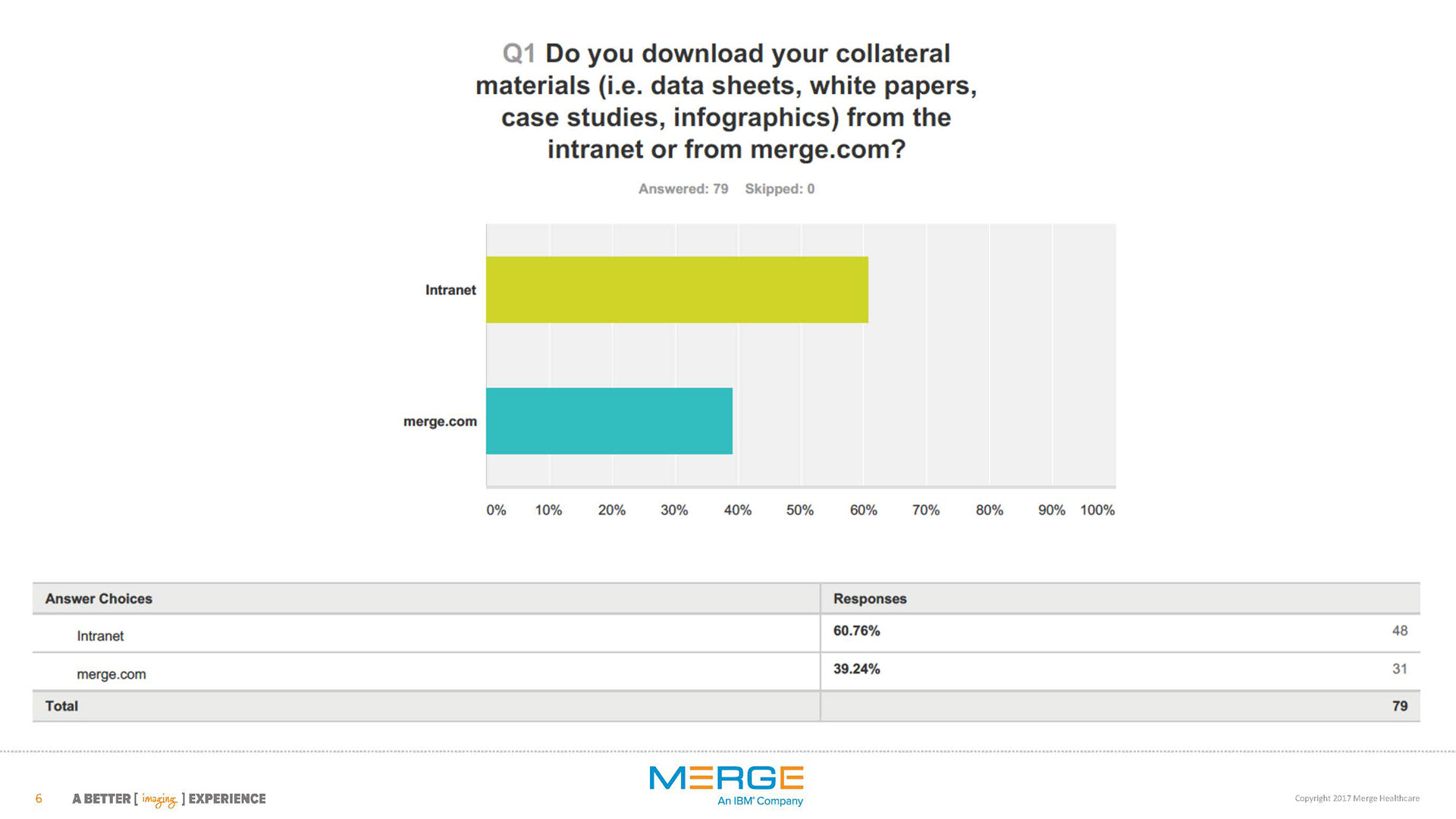 We needed information on how our Sales Teams interacted with the Marketing page along with its resources, so I took the lead in the user research. In October 2016, Marketing sent a five-question survey to the Sales Teams. The objective of this survey was to gather feedback for 2017 expectations, and find out if we are providing the best materials, in the best format, and delivering them in the most effective manner.