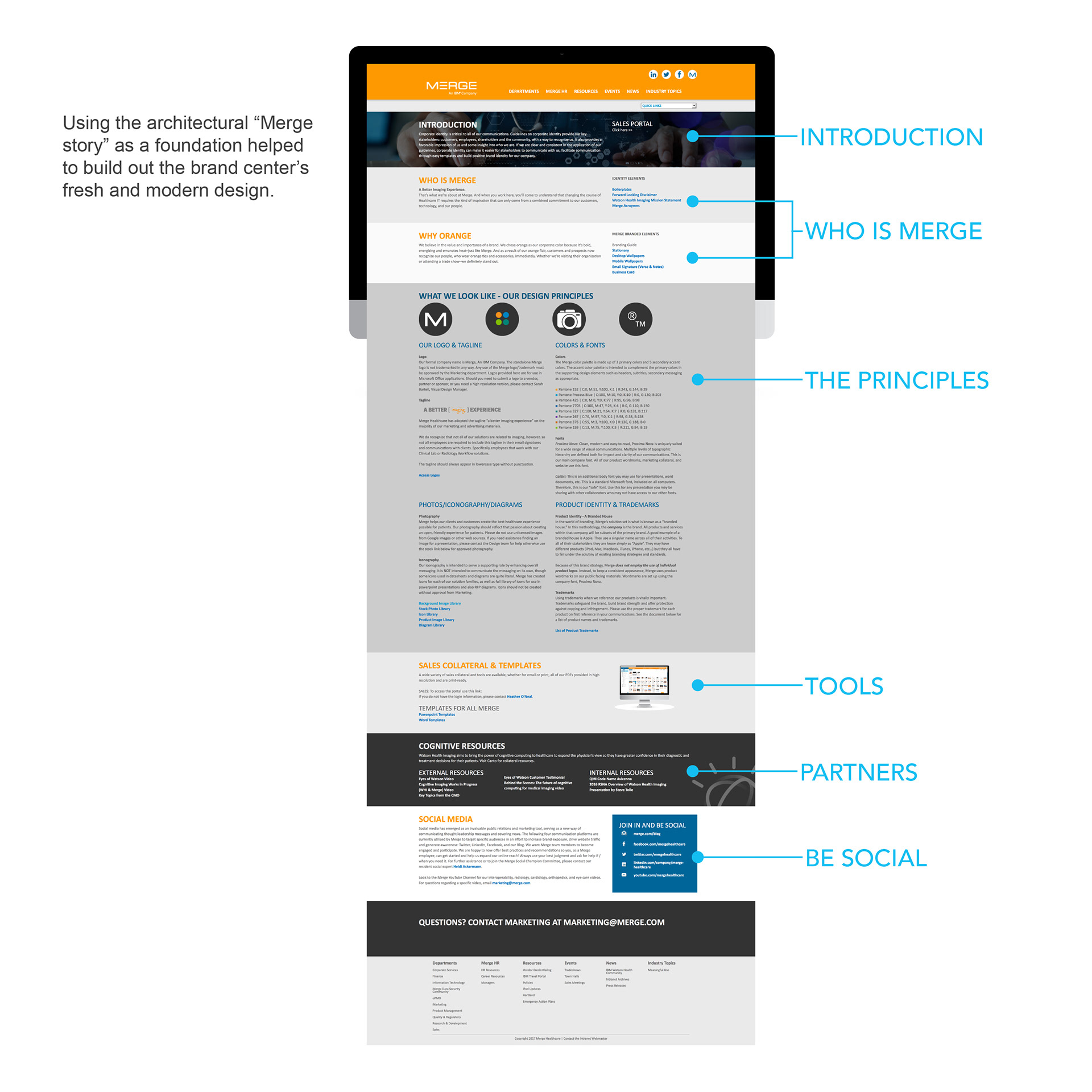 I found what the page was lacking was a foundation, so I focused on an idea to design the page as a "brand center" that would teach Merge brand standards, communicate how to use these branded resources effectively, by telling a story: (1) introduce users to the brand center, (2) who is Merge, (3) what is the Merge brand, (4) the design principles, (5) tools to use, (6) information about partners and affiliations, and (7) how to join in on social media discussions.