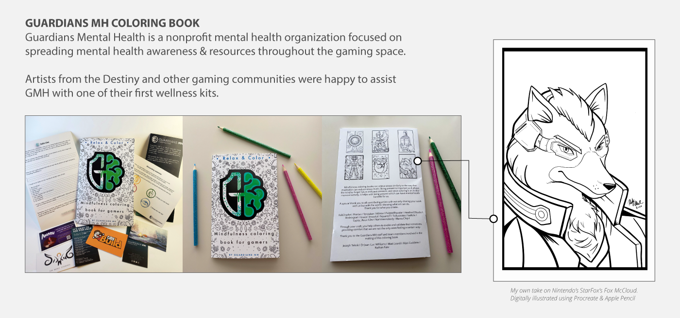 The subjects on my sketchbook pages were inspired by multiple references from video games, technology, animals, and nature using a mixture of traditional and digital mediums. With Twitch, I stream my digital artwork live for fans to enjoy as they watch, listen to music, and are able to chat directly to me.